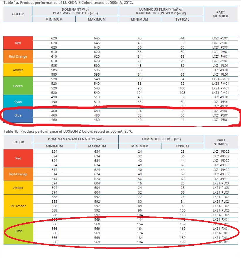 Looking lower down you can see that the “nice” looking LIME colour produces anything from 144lm to 199lm – which is around 4.5 times brighter to the human eye vs. the blue.